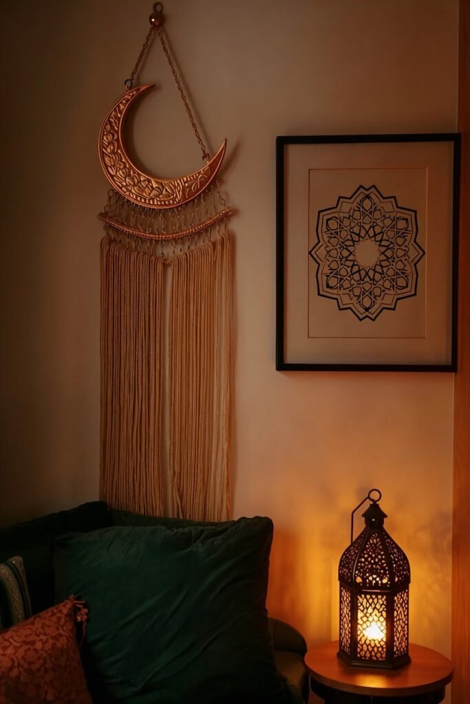 A framed “Bismillah” or “Alhamdulillah” print in gold and white is modern, elegant, and works in any home. I’ve got one in my living room and get compliments on it regularly.